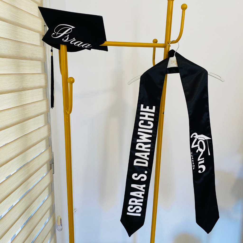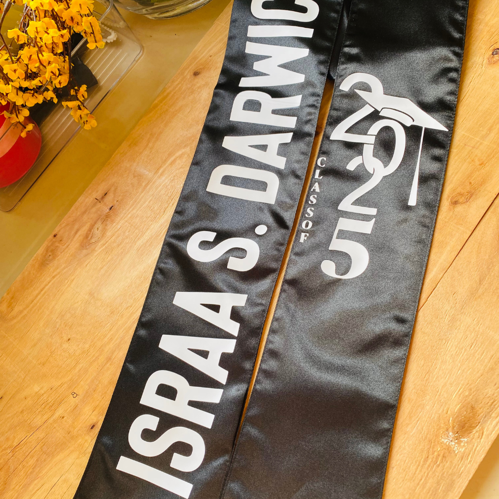 شال ساتان فاخر بطباعة مخصّصة (اسم، سنة، تخصّص… حسب الطلب)