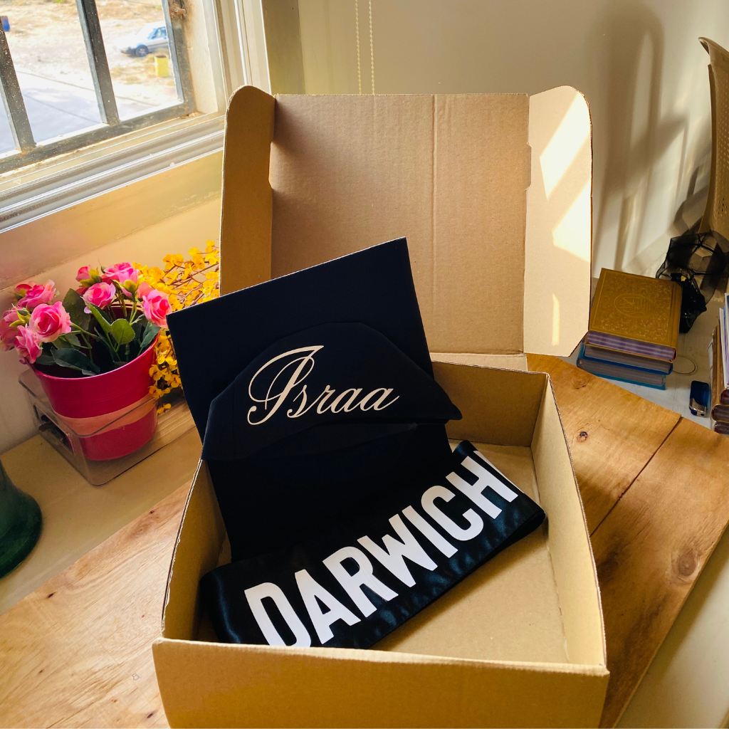 طقم التخرّج الفخم يأتي داخل بوكس هدية أنيق مزوّد بشريطة ساتان ومطبوعة عليه اسم الخريج/الخريجة، ليكون الهدية المثالية في يوم الاحتفال