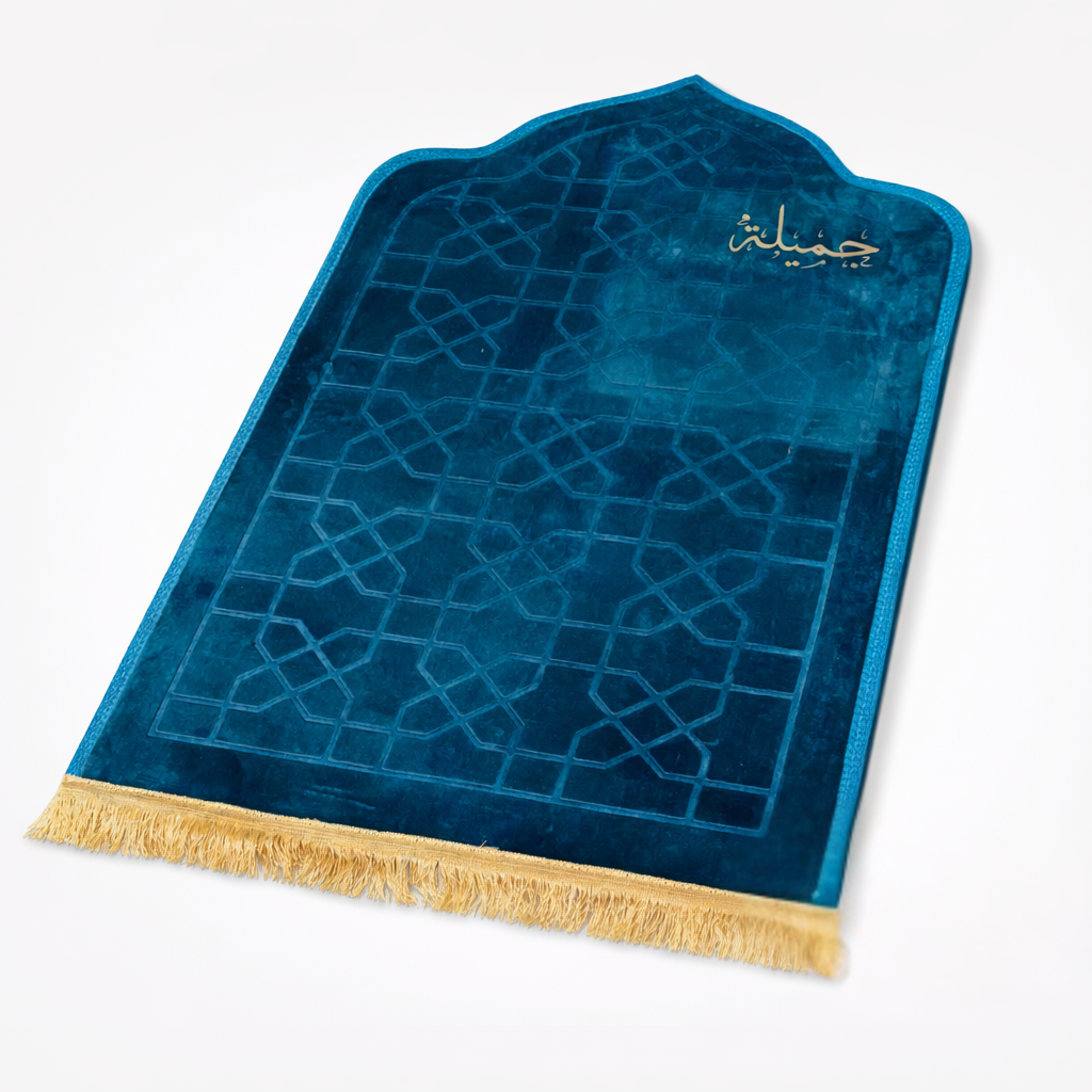 هدية روحانية متكاملة بتصميم فاخر وشخصي. يحتوي على سجادة صلاة محراب باللون البترولي + توب صلاة باللون الزهر مطبوع عليهم اسم "جميلة" ، قرآن كريم باللون الزهر، فاصل كتاب (ريشة ذهبية باسم "جميلة")، مع طباعة الاسم على البوكس . مثالي للمناسبات الدينية ولتقديم هدية تبقى بذاكرة من تحب.