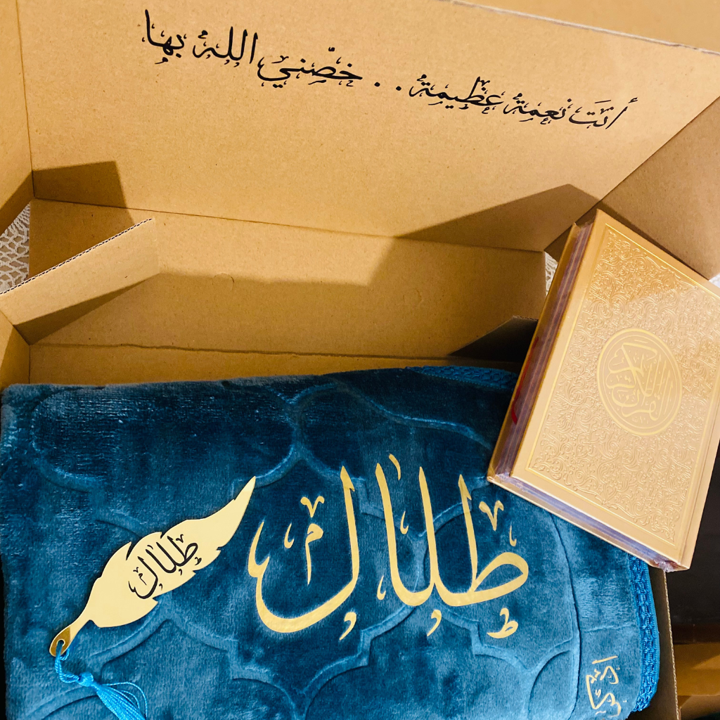 هدية روحانية متكاملة بتصميم فاخر وشخصي. يحتوي على سجادة صلاة محراب باللون البترولي مطبوع عليها اسم "طلال"  + "اذكرني بدعوة في صلاتك" ، قرآن كريم باللون الدهبي، فاصل للكتاب الريشة الذهبية باسم "طلال" ، مع طباعة عبارة "أنتَ نعمة عظيمة .. خصني الله بها" عالبوكس من الداخل . مثالي للمناسبات الدينية ولتقديم هدية تبقى بذاكرة من تحب.