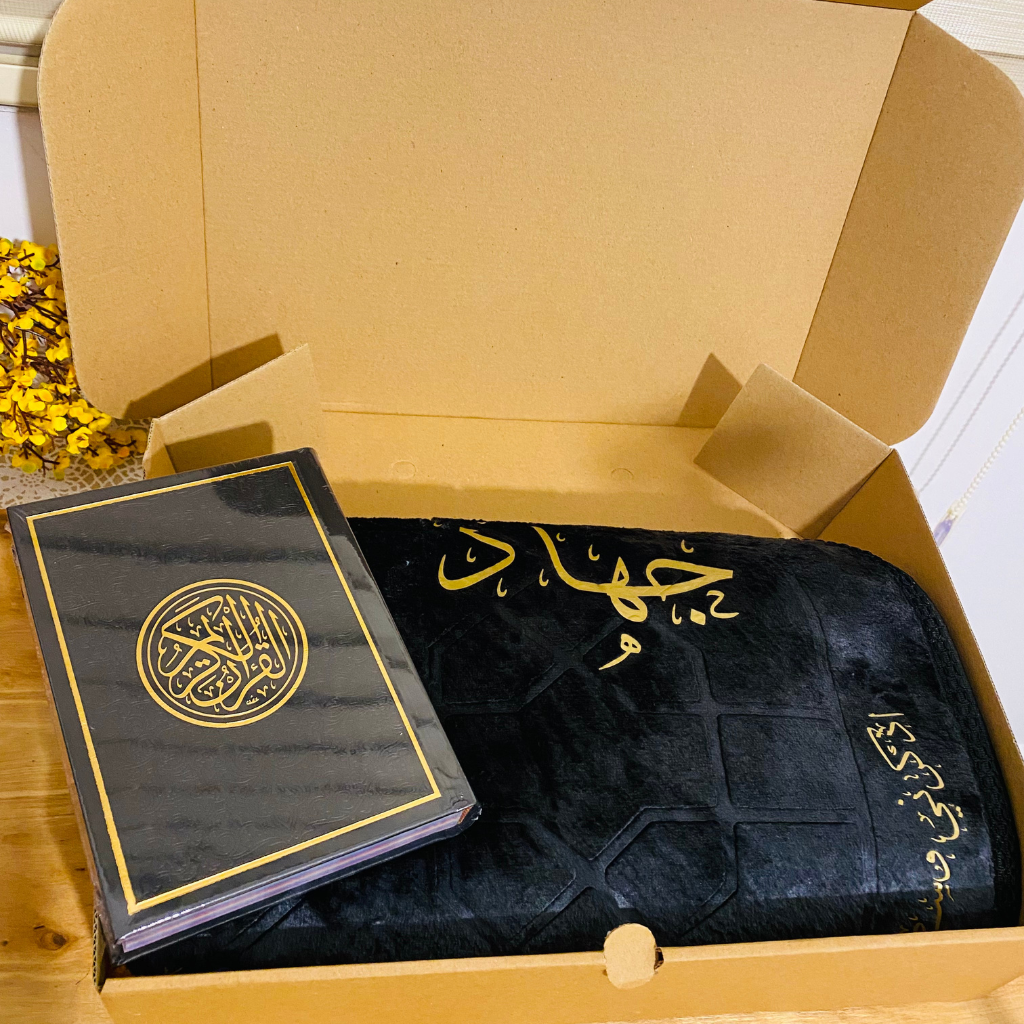 هدية روحانية متكاملة بتصميم فاخر وشخصي. يحتوي على سجادة صلاة محراب باللون الأسود مطبوع عليها اسم "جهاد" +"اذكرني وسط السجود بدعوة" ، قرآن كريم باللون الأسود. مثالي للمناسبات الدينية ولتقديم هدية تبقى بذاكرة من تحب.