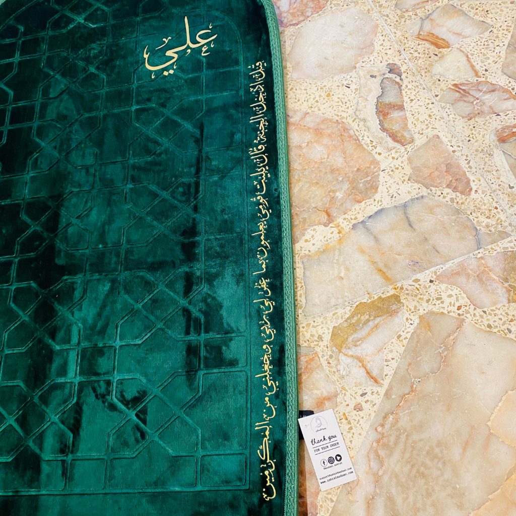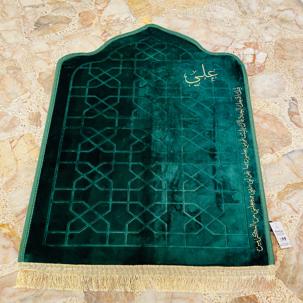 هدية روحانية متكاملة بتصميم فاخر وشخصي. يحتوي على سجادة صلاة محراب باللون الزيتي مطبوع عليها اسم "علي"  + "قيل ادخل الجنة قال يليت قومي يعلمون بما غفر لي ربي وجعلني من المكرمين "+ ريشة ذهبية باسم "علي" ، مع طباعة الاسم عالبوكس . مثالي للمناسبات الدينية ولتقديم هدية تبقى بذاكرة من تحب.