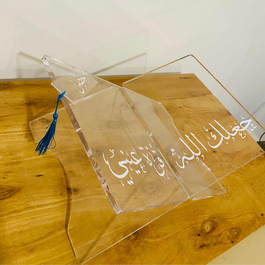 ستاند المصحف المصنوع من البليكسي الشفاف عالي الجودة مرفق بمصحف أنيق، فاصل شفاف مع شرّابة، مسبحة راقية وطباعة حسب الطلب — ليقدّم لك تجربة قراءة منظّمة ولمسة شخصية أنيقة.